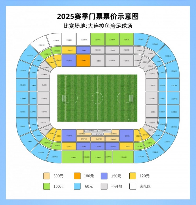本賽季,大連英博的主場(chǎng)仍是梭魚灣足球場(chǎng)。俱樂部將主場(chǎng)看臺(tái)散票劃分為6個(gè)區(qū)域,每個(gè)區(qū)域票價(jià)不同,分別為60元、100元、120元、150元、180元和300元。