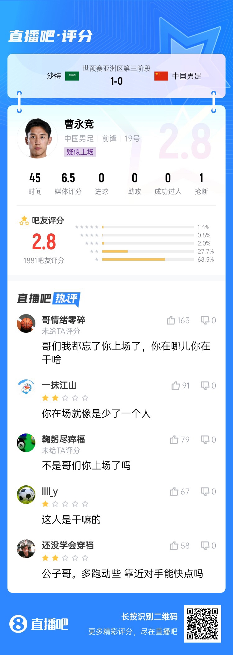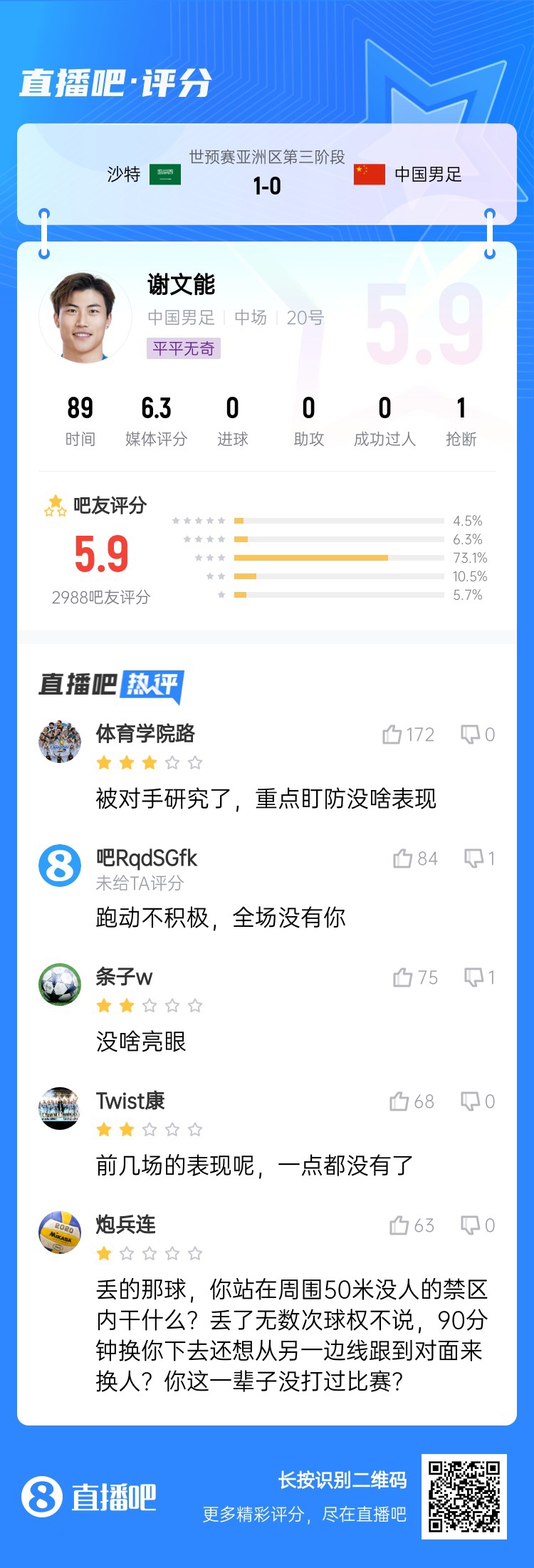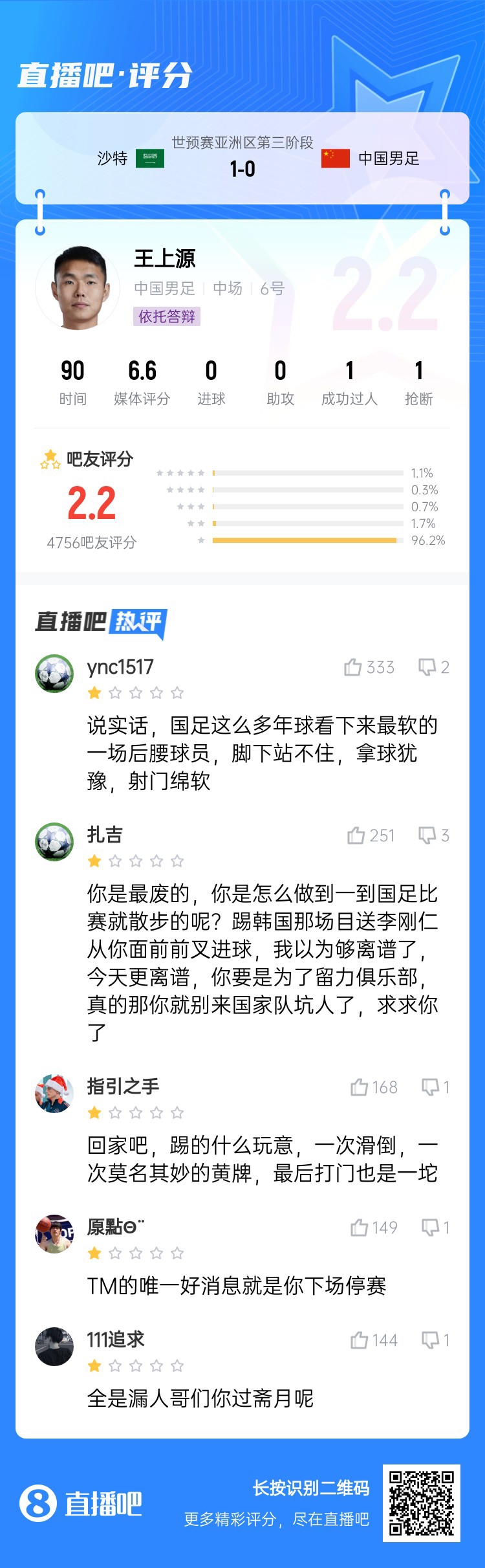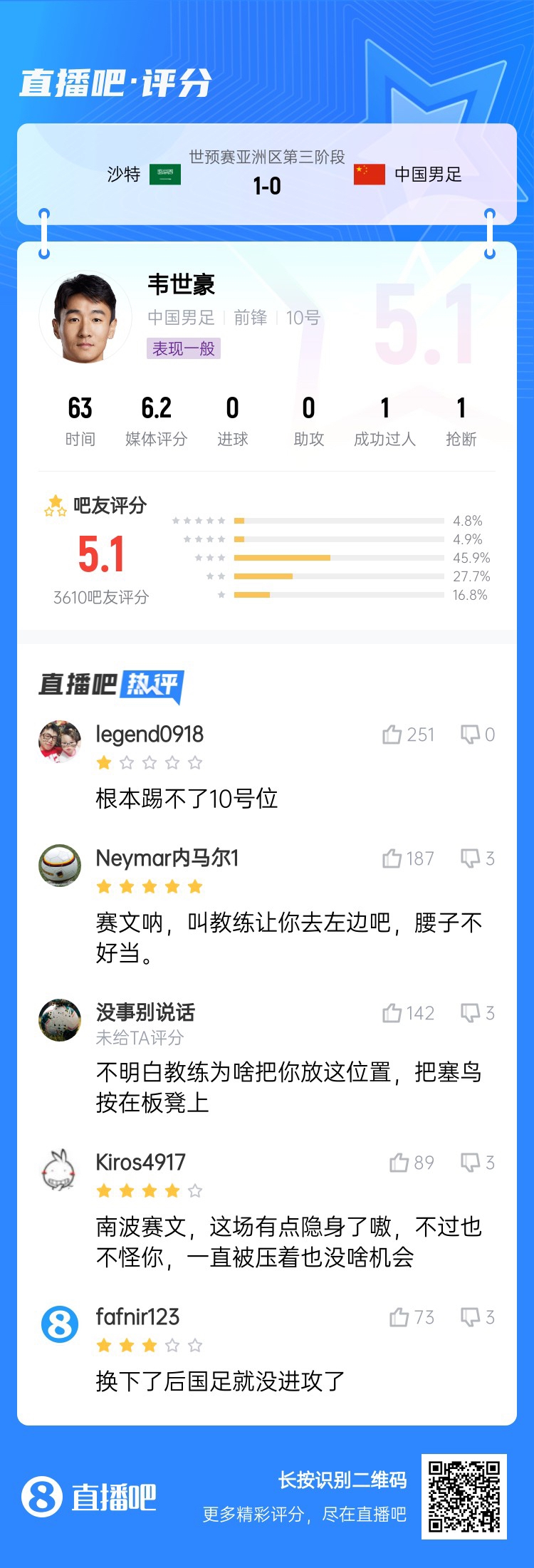 18強(qiáng)賽關(guān)鍵戰(zhàn),國(guó)足0-1不敵沙特,沒(méi)能擺脫小組墊底。吧友評(píng)分中,國(guó)足中場(chǎng)球員普遍低分,韋世豪5.1分,王上源2.2分,曹永競(jìng)2.8分,謝文能5.9分。