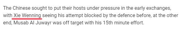 亞足聯(lián)官網(wǎng)在報道本場比賽時鬧出烏龍,他們在戰(zhàn)報中將國足中場謝文能的拼音名“Xie Wenneng”寫為了“Xie Wenning”。