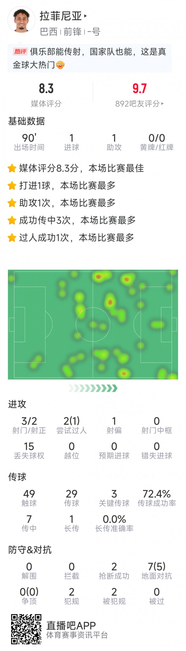3月21日訊 在本輪世預(yù)賽南美區(qū)比賽,巴西2-1擊敗哥倫比亞。本場比賽拉菲尼亞傳射建功,以下為他在本場數(shù)據(jù):