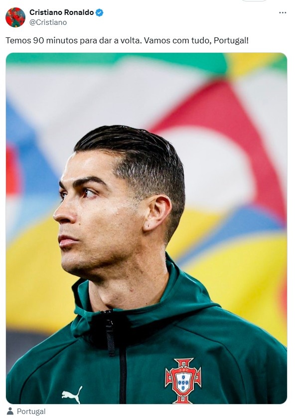 C羅曬出了自己的照片,并配文寫道:“我們有90分鐘的時間扭轉(zhuǎn)局面,讓我們?nèi)σ愿埃咸蜒?!?/span>