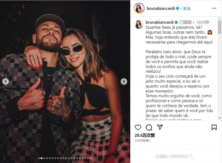 2月5日訊 內(nèi)馬爾的女友Bruna Biancardi今天在Instagram發(fā)文,祝福33歲生日的男友。