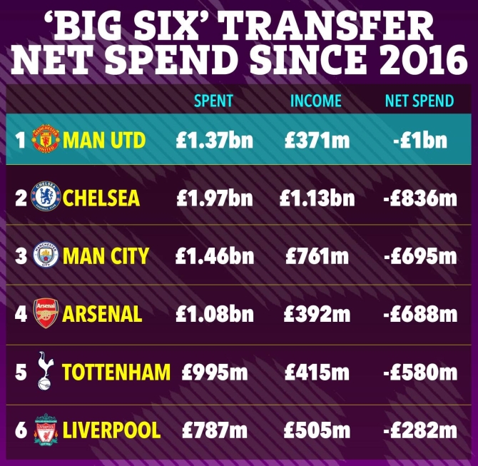 1、曼聯(lián):支出13.7億;收入3.71億;凈支出10億