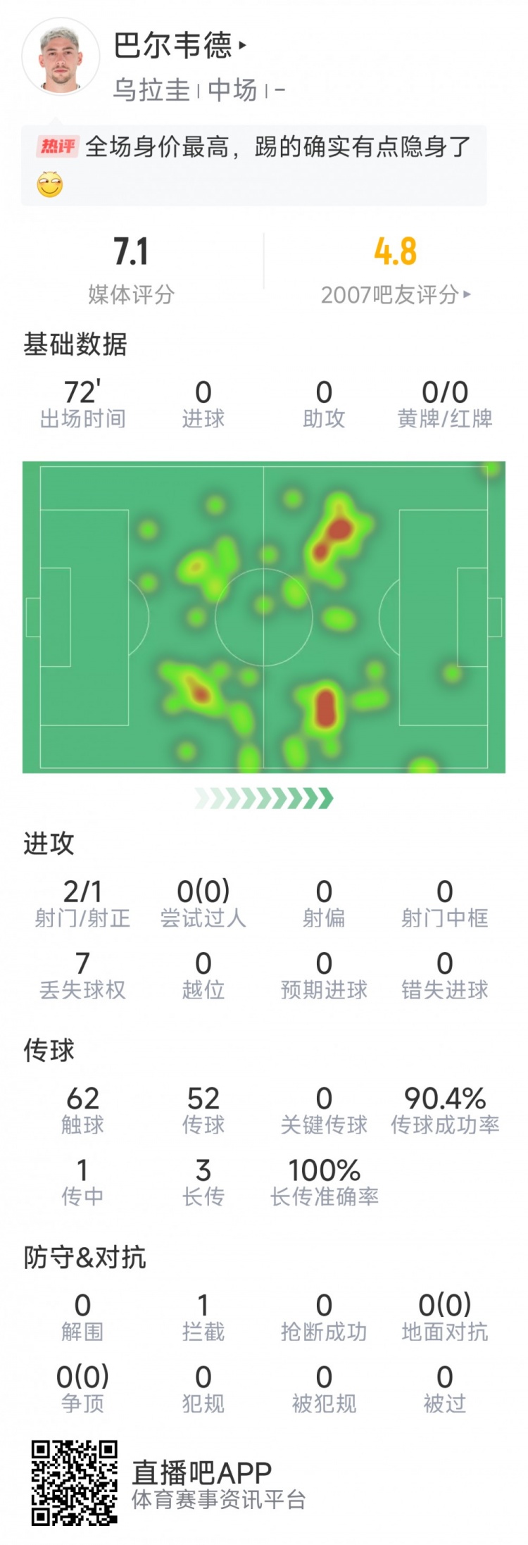 3月22日訊 在本輪南美區(qū)世預(yù)賽,烏拉圭0-1不敵阿根廷。巴爾韋德首發(fā)出場(chǎng)被提前換下,以下為他在本場(chǎng)數(shù)據(jù):