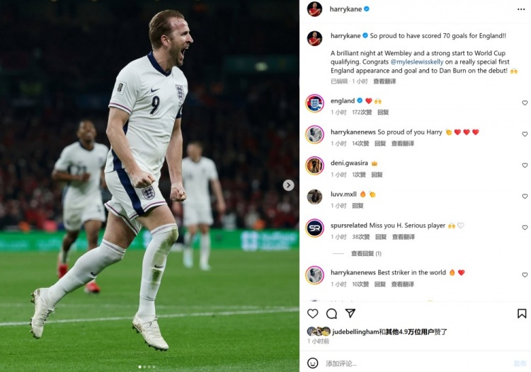 本場比賽凱恩破門,小將斯凱利也取得國家隊處子球,凱恩賽后曬出慶祝進球照片,配文寫道:“為打進國家隊第70球感到無比自豪。在溫布利球場的美妙之夜,也為世界波預選賽開了一個好頭。祝賀斯凱利度過一個特殊的首秀并且取得進球,也祝賀丹-伯恩完成球隊首秀!”