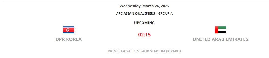 03月22日訊 亞足聯(lián)官網(wǎng)顯示,18強賽第8輪,朝鮮主場對陣阿聯(lián)酋的比賽將在沙特利雅得進行。