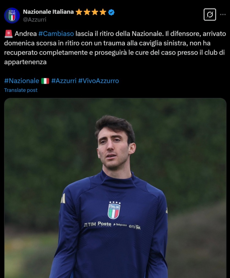 意大利隊(duì)官方:坎比亞索因左腳踝傷勢(shì)退出本期國(guó)家隊(duì),將返回尤文