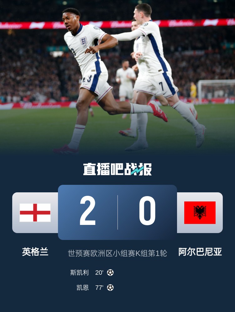 18歲斯凱利首秀迎處子球,凱恩斬獲英格蘭生涯第70球,英格蘭主場(chǎng)2-0戰(zhàn)勝阿爾巴尼亞。