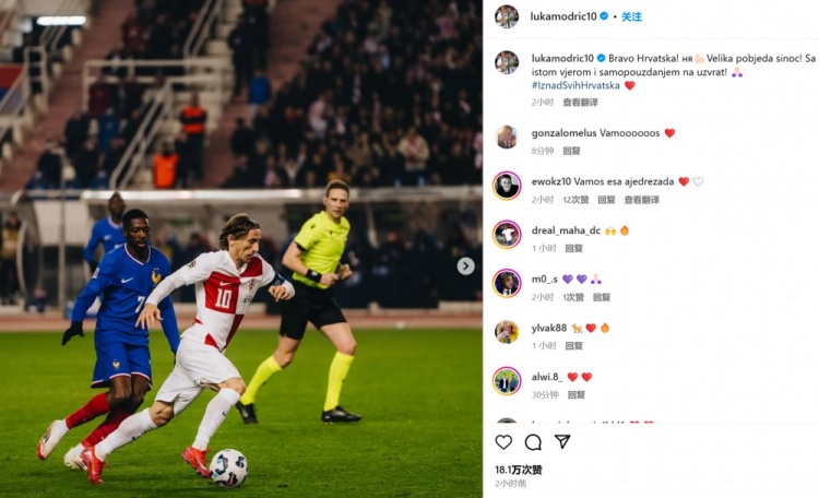 3月22日訊 克羅地亞在歐國(guó)聯(lián)八強(qiáng)戰(zhàn)首回合主場(chǎng)2-0擊敗法國(guó),隊(duì)長(zhǎng)莫德里奇在賽后通過社媒慶祝勝利。