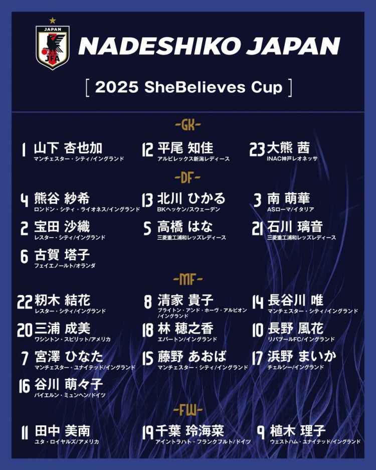 門將:1-山下杏也加(曼城女足)、12-平尾知佳(新瀉天鵝女足)、23-大熊茜(神戶雌獅)