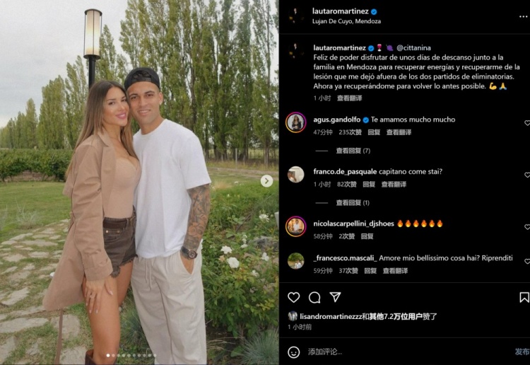 勞塔羅曬出和家人度假的照片,并寫道:我很開(kāi)心能夠和家人在門多薩休息幾天,從而補(bǔ)充能量。我因傷缺席了兩場(chǎng)世界杯預(yù)選賽,希望能從傷病中恢復(fù)過(guò)來(lái)。 現(xiàn)在我正在康復(fù)當(dāng)中,以便盡快復(fù)出。
