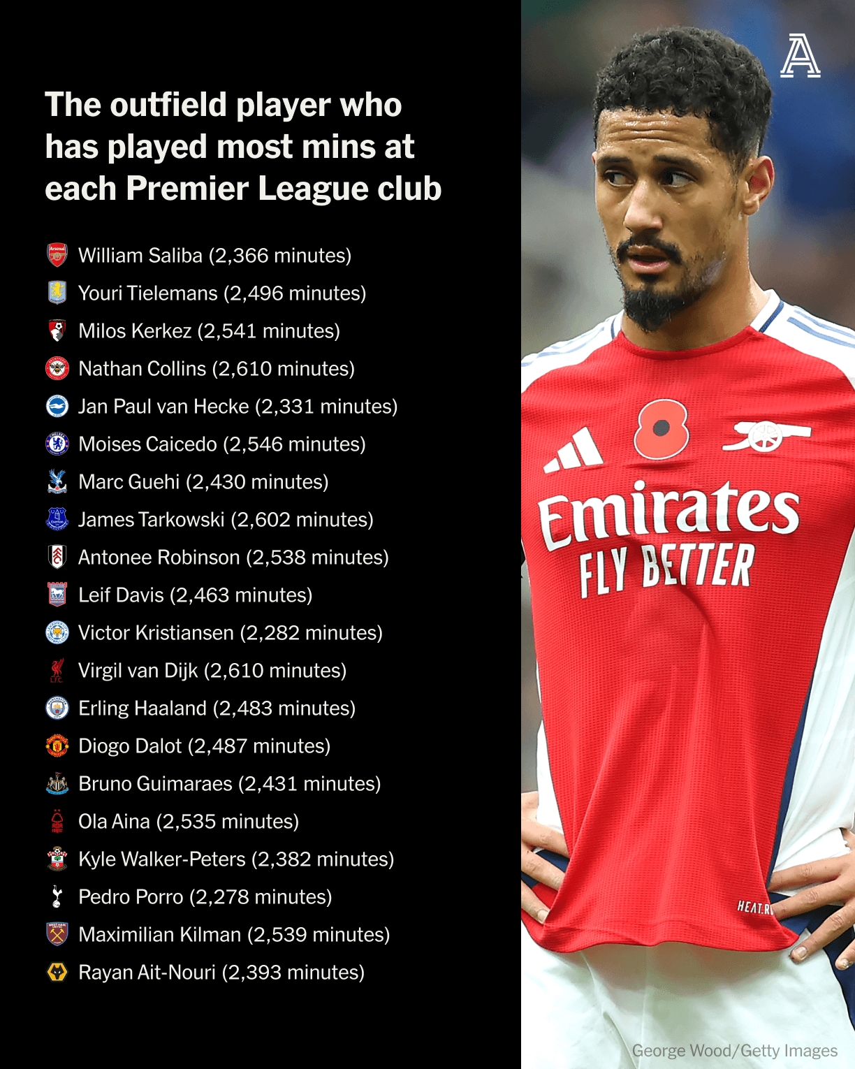 英超各隊出場時間最多的外場球員:薩利巴、范迪克、哈蘭德在列