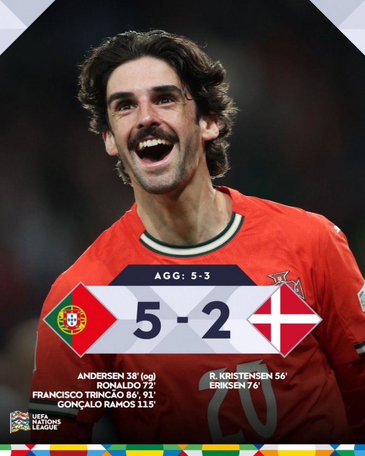 3月24日訊 歐國(guó)聯(lián)八強(qiáng)戰(zhàn)次回合,葡萄牙加時(shí)賽5-2擊敗丹麥,總比分5-3晉級(jí)四強(qiáng),半決賽將戰(zhàn)德國(guó)。