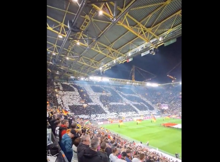 3月24日訊 德國(guó)在歐國(guó)聯(lián)八強(qiáng)戰(zhàn)次回合再戰(zhàn)意大利,賽前多特蒙德的主場(chǎng)球迷們打出了巨型TIFO致敬德國(guó)足協(xié)成立125周年。