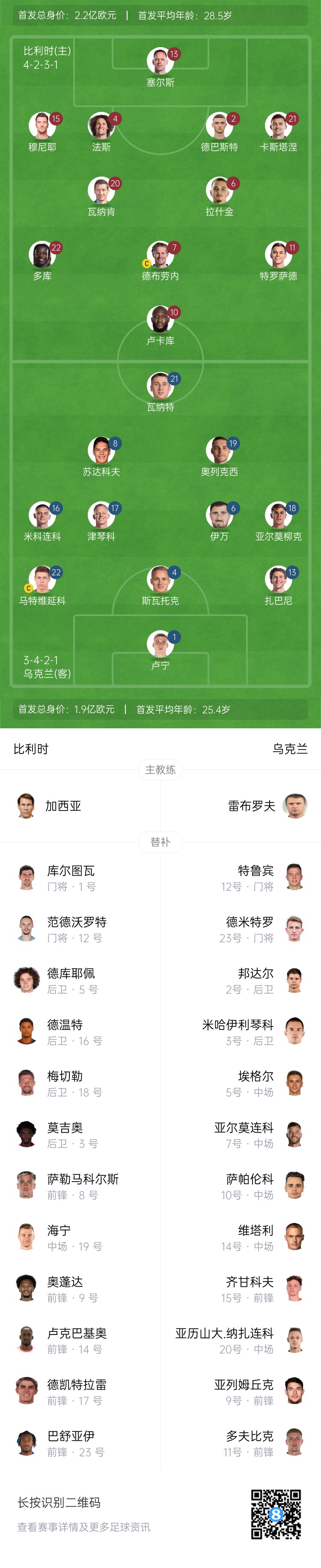 比利時(shí)首發(fā):13-塞爾斯、15-穆尼耶、4-法斯、2-德巴斯特、21-卡斯塔涅、20-瓦納肯、6-拉什金、7-德布勞內(nèi)、11-特羅薩德、22-多庫、10-盧卡庫