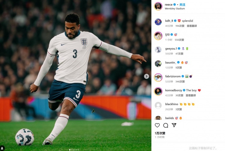 兩人也都在賽后通過社媒曬出自己的比賽照,但并未附加文字內(nèi)容。賴斯和霍爾等隊友紛紛送上鼓勵:“為你感到高興”、“棒極了”…