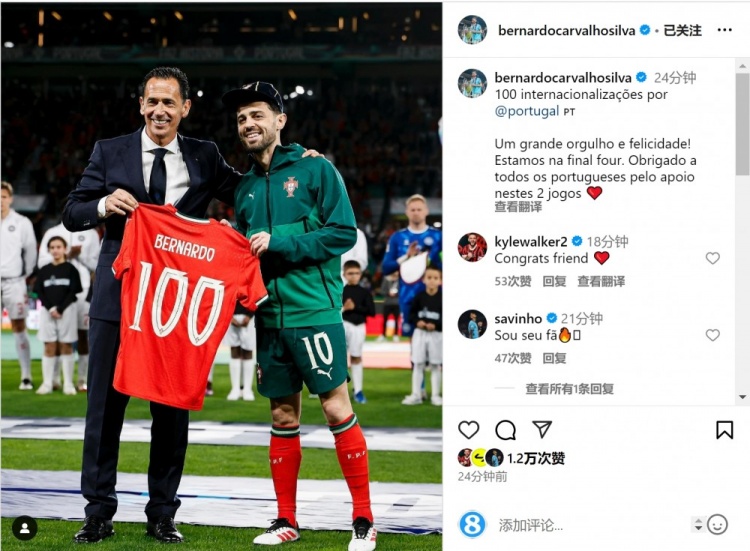 此役是B席為葡萄牙隊(duì)出戰(zhàn)的第100場比賽,因此獲贈(zèng)紀(jì)念球衣。他在社交媒體上曬出照片,并寫道:“為葡萄牙國家隊(duì)出戰(zhàn)100場比賽,我感到非常自豪和高興!我們進(jìn)入了四強(qiáng),感謝所有葡萄牙球迷在兩回合比賽中的支持?!?/p>