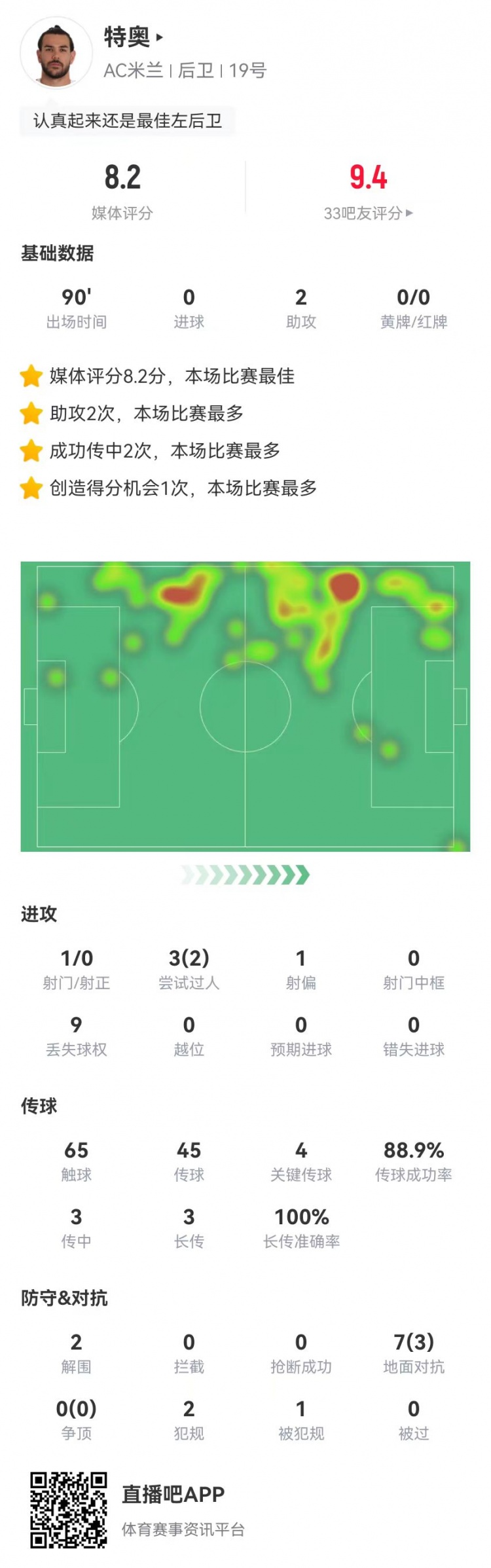 2月6日訊 米蘭在本輪意大利杯3-1擊敗羅馬,特奧本場數(shù)據(jù)如下: