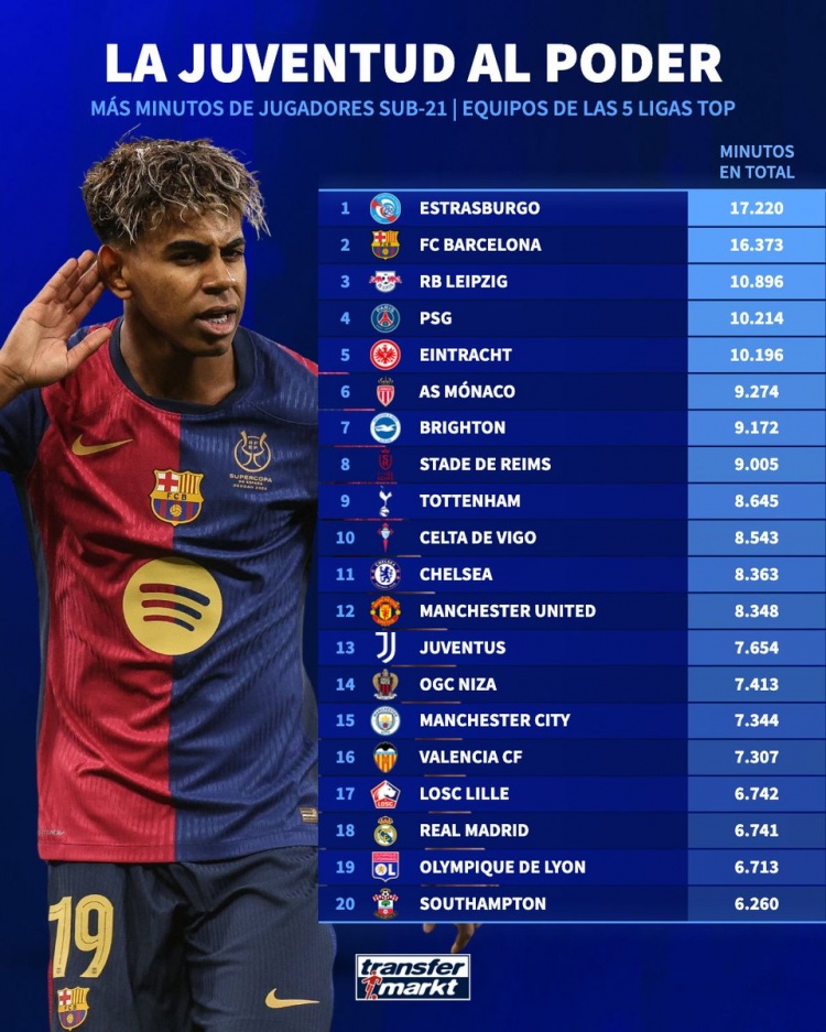 3月27日訊 德國轉(zhuǎn)會市場統(tǒng)計(jì)了本賽季五大聯(lián)賽球隊(duì)U21球員的總出場時(shí)間,并列出榜單,斯特拉斯堡居首,巴塞羅那、萊比錫排名二三位。