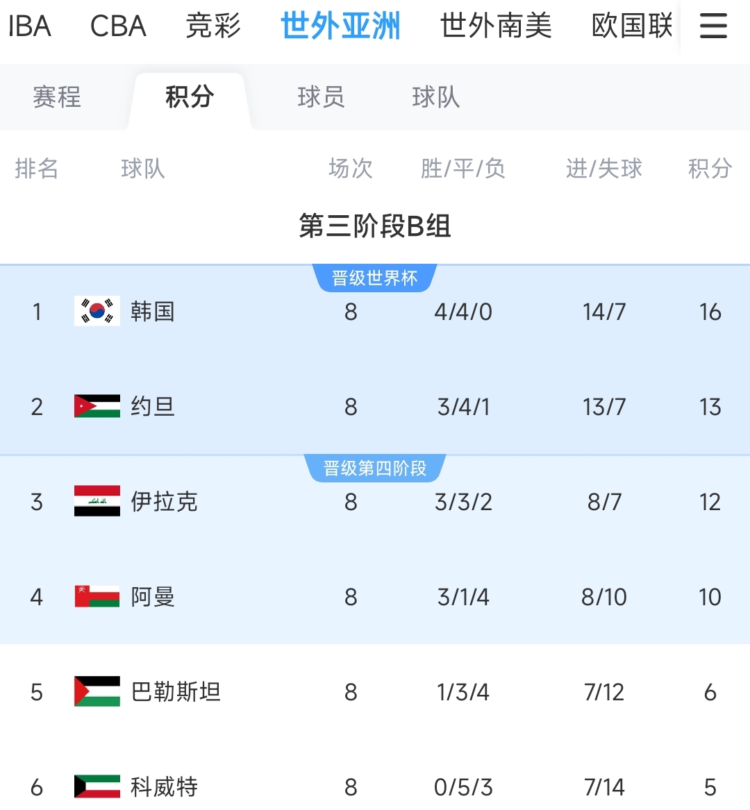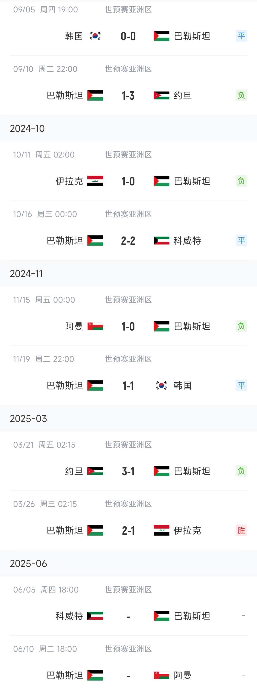 18強(qiáng)賽B組積分榜上,巴勒斯坦積6分排名小組第5,依然存在小組前四晉級(jí)附加賽的希望。在18強(qiáng)賽前8輪比賽中,巴勒斯坦取得1勝3平4負(fù),其中兩回合交手韓國隊(duì)均取得平局。