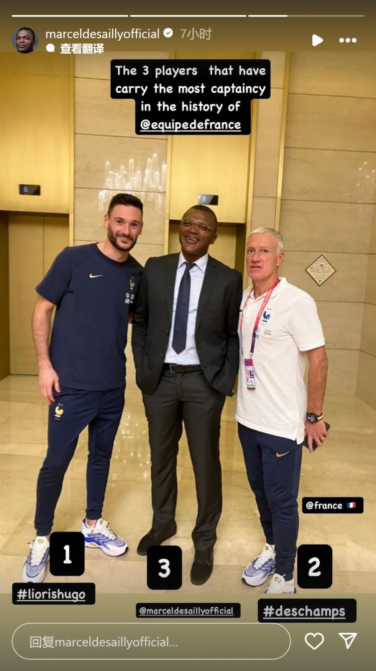 德塞利社媒曬出與德尚、洛里的合照,并配文:“法國(guó)隊(duì)史擔(dān)任隊(duì)長(zhǎng)次數(shù)最多的三名球員。”