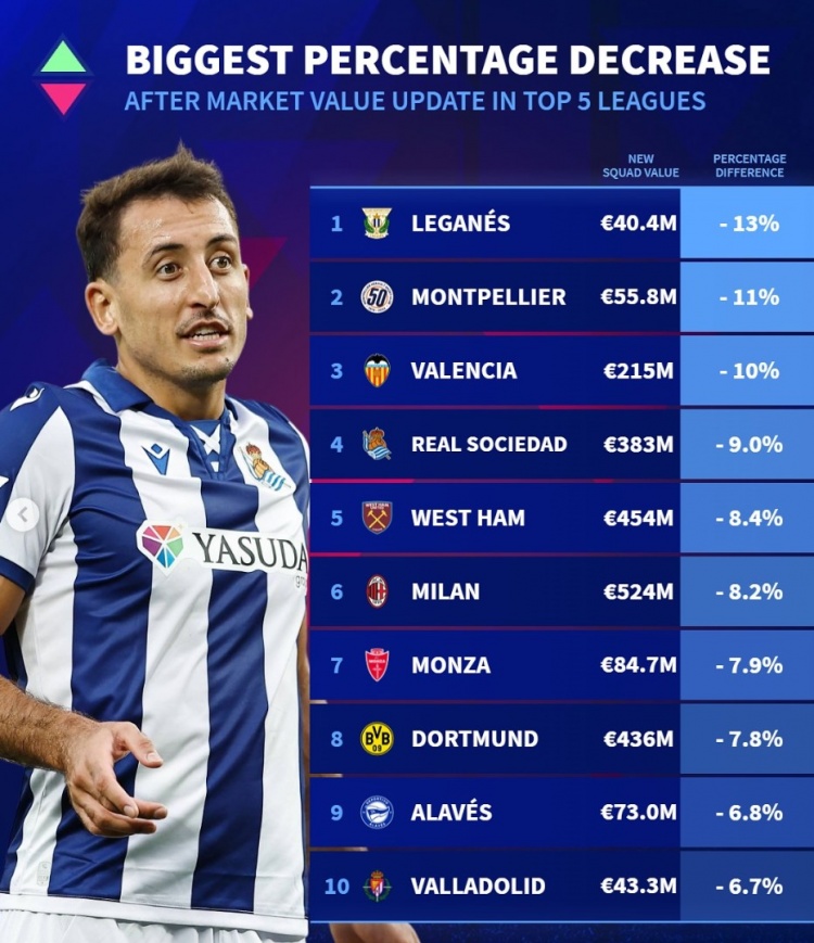 五大聯(lián)賽球隊身價貶值比例最高榜:歐元