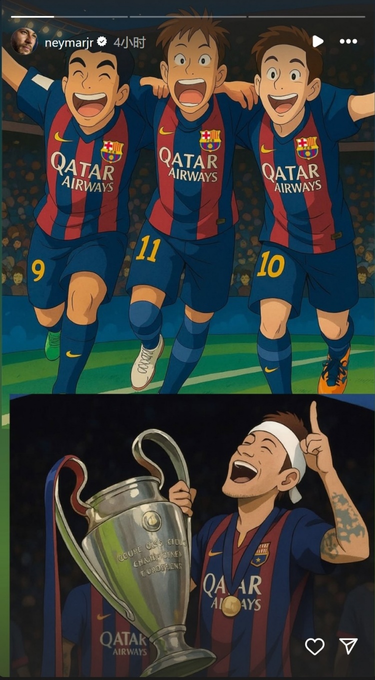 內(nèi)馬爾在社交媒體上曬出與梅西、蘇亞雷斯一起慶祝,以及自己手拿歐冠獎(jiǎng)杯的漫畫圖片,追憶那段美好的時(shí)光。