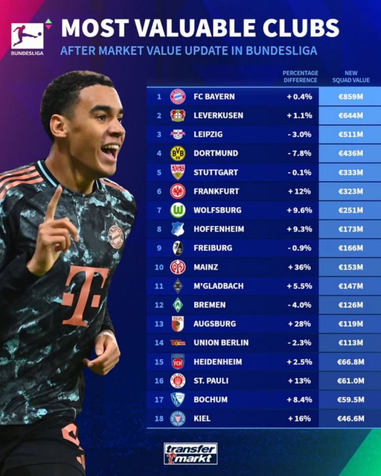 3月28日訊 德轉(zhuǎn)在當(dāng)?shù)貢r(shí)間3月27日更新了德甲球員身價(jià),并列出了德甲各隊(duì)身價(jià)排名,拜仁8.59億歐居首,勒沃庫(kù)森、萊比錫、多特、斯圖加特2-5位。