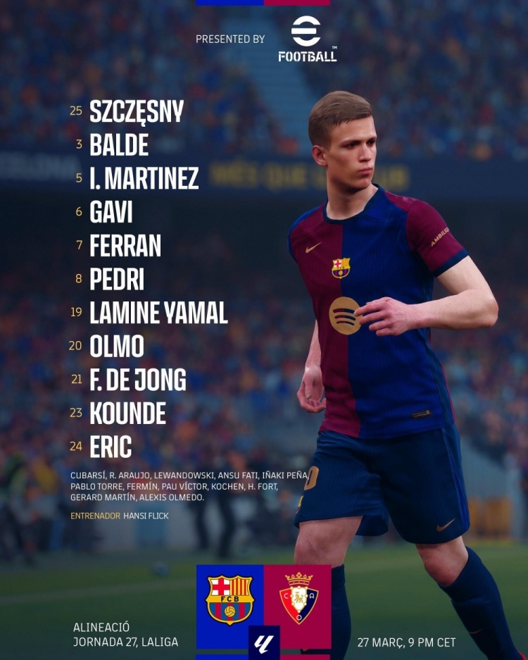 3月28日訊 西甲第27輪補(bǔ)賽,巴薩vs奧薩蘇納首發(fā)出爐。記者Toni Juanmartí談到了本場比賽的首發(fā)陣容。