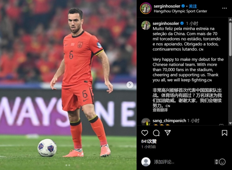 塞爾吉尼奧更新個(gè)人社媒,曬出個(gè)人賽場(chǎng)照,并用中英葡三種語言寫道:非常高興能夠首次代表中國(guó)國(guó)家隊(duì)出戰(zhàn)。體育場(chǎng)內(nèi)有超過 7 萬名球迷為我們加油助威。謝謝大家,我們會(huì)繼續(xù)努力。