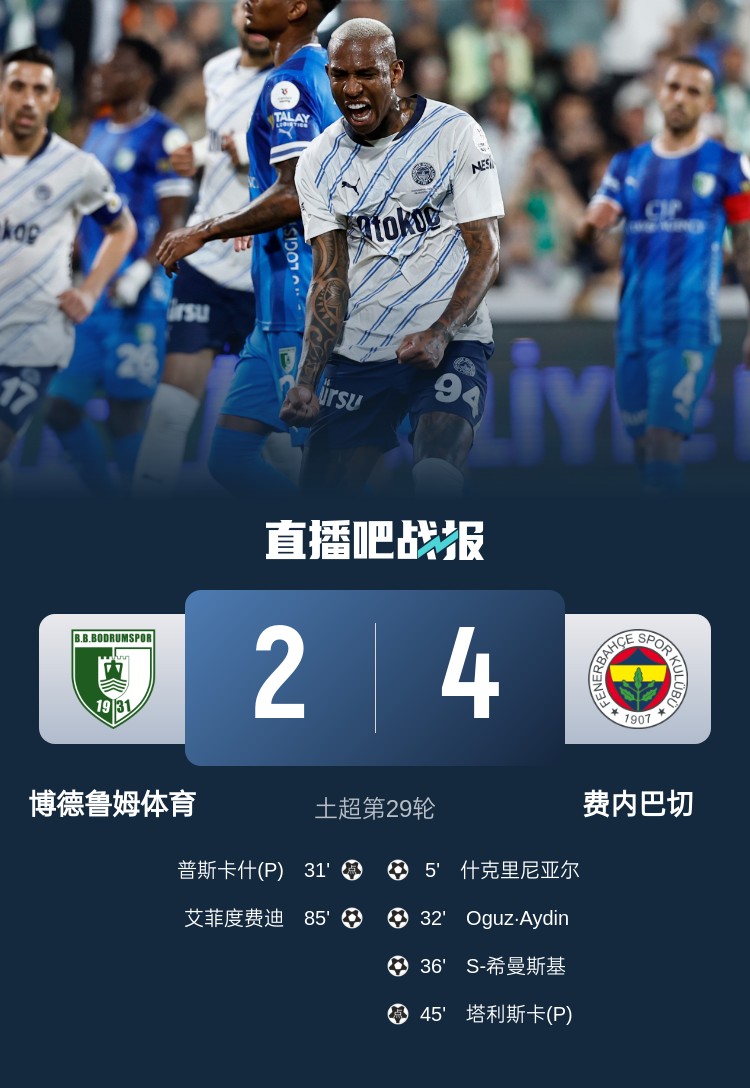費內(nèi)巴切本輪4-2擊敗博德魯姆體育,費內(nèi)巴切上半場就多點開花,比賽最終費內(nèi)巴切4-2取勝。