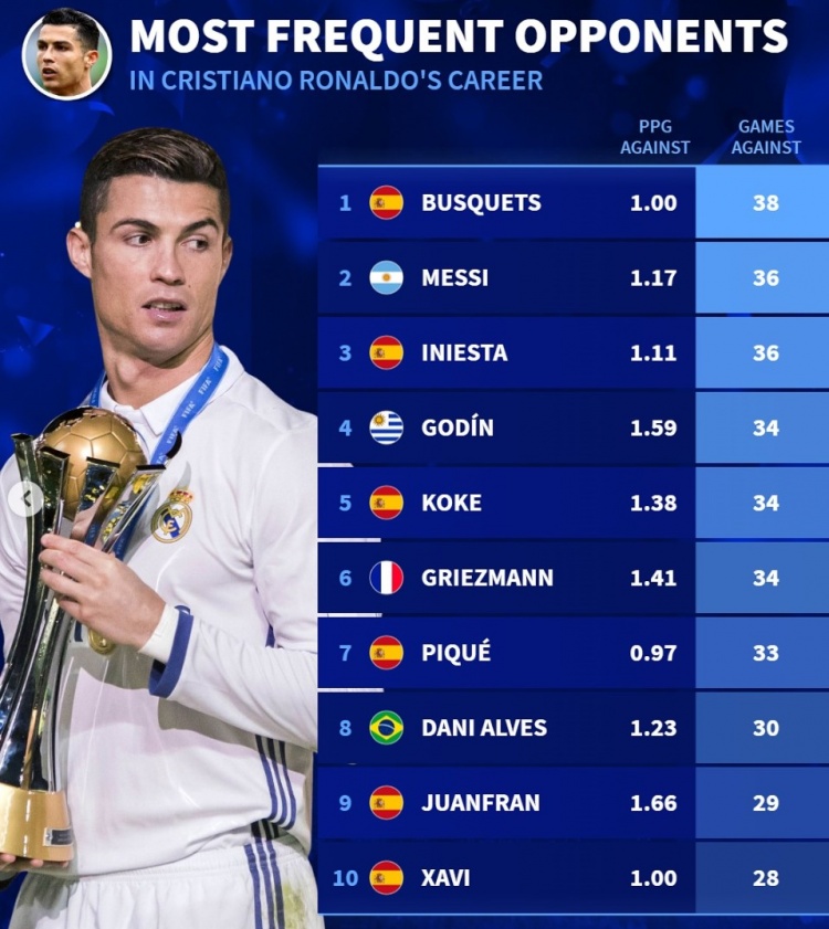 2月6日訊 C羅已經迎來40歲生日,《轉會市場》也統(tǒng)計了他生涯交鋒次數最多的對手全是西甲故人。