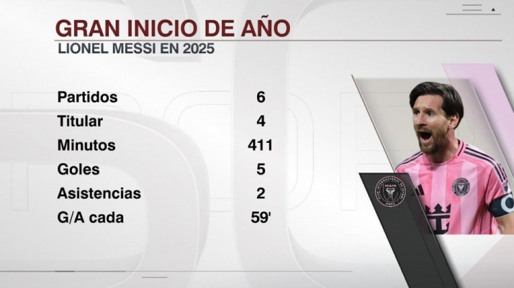 據(jù)ESPN統(tǒng)計(jì),梅西今年出戰(zhàn)6場比賽,其中4場首發(fā),出場時(shí)間411分鐘,打進(jìn)5球助攻2次,平均每59分鐘參與1球。