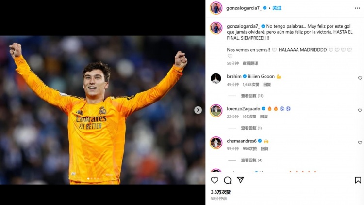 他也在賽后通過(guò)社媒曬出自己的慶祝照,并配文:“我高興到不知道該說(shuō)什么了……我很高興能夠打進(jìn)這粒永遠(yuǎn)不會(huì)忘記的進(jìn)球,但更高興的是取得勝利。永遠(yuǎn)要戰(zhàn)斗到最后一刻!半決賽見(jiàn)!馬德里前進(jìn)!”
