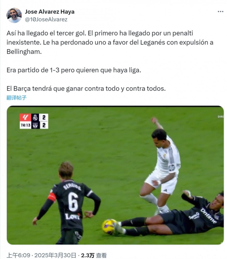 對(duì)此西班牙六臺(tái)巴薩跟隊(duì)記者Jose Alvarez Haya在社交媒體上寫(xiě)道:“伯納烏的丑聞,判罰了一個(gè)不存在的點(diǎn)球(指居勒爾倒地獲點(diǎn))?!?/p>
