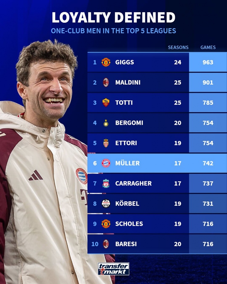 4月1日訊 德國轉(zhuǎn)會市場統(tǒng)計了五大聯(lián)賽歷史一人一城球員的出場次數(shù),并列出榜單,吉格斯、馬爾蒂尼、托蒂位居前三,穆勒排名第6位。