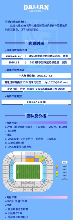 2月6日訊 大連英博俱樂部發(fā)布2025賽季票務(wù)公告,開啟新賽季票務(wù)出售。