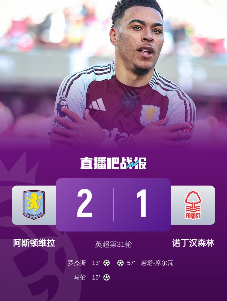 04月06日訊 英超第31輪維拉2-1擊敗森林,近期三線高歌猛進(jìn):足總杯進(jìn)4強(qiáng)、聯(lián)賽3連勝升第6,、歐冠闖入8強(qiáng)。