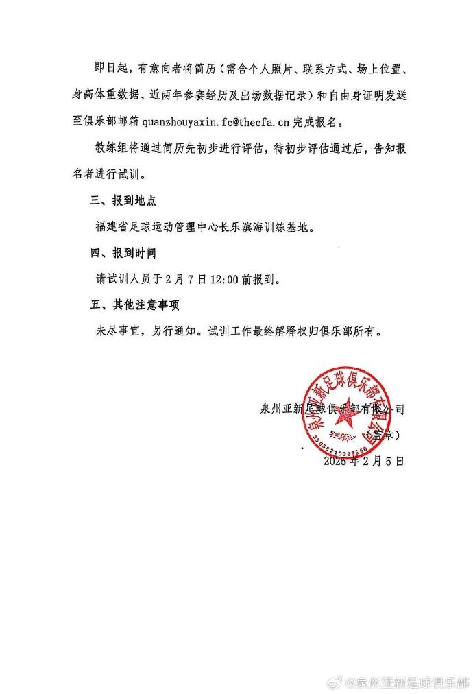 2月6日訊 中乙泉州亞新發(fā)布一線隊(duì)試訓(xùn)公告,具備職業(yè)聯(lián)賽經(jīng)歷的球員優(yōu)先,并且要有自由身證明。