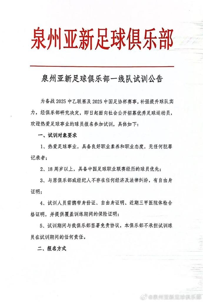 泉州亞新官方表示,為備戰(zhàn)新賽季中乙聯(lián)賽及中國足協(xié)杯,補(bǔ)充提升球隊(duì)實(shí)力,俱樂部決定公開招募優(yōu)秀足球運(yùn)動(dòng)員。