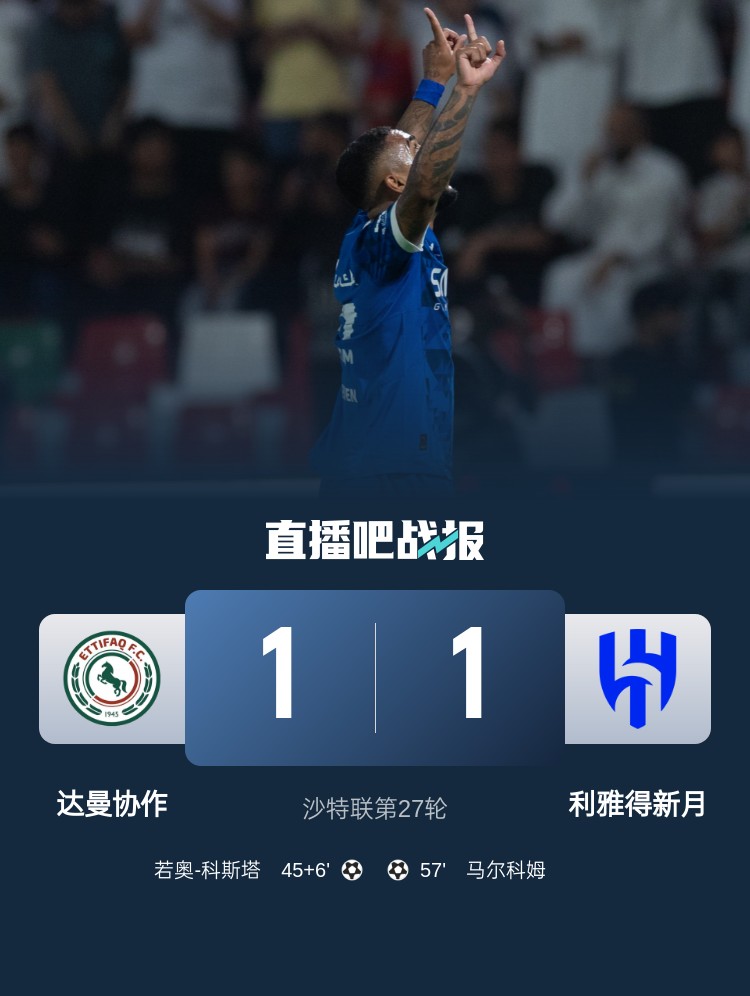 沙特聯(lián)第27輪,利雅得新月1-1達(dá)曼協(xié)作。上半場,若奧-科斯塔再補(bǔ)時(shí)最后時(shí)刻世界波破門;下半場,洛迪助攻馬爾科姆破門扳平比分。