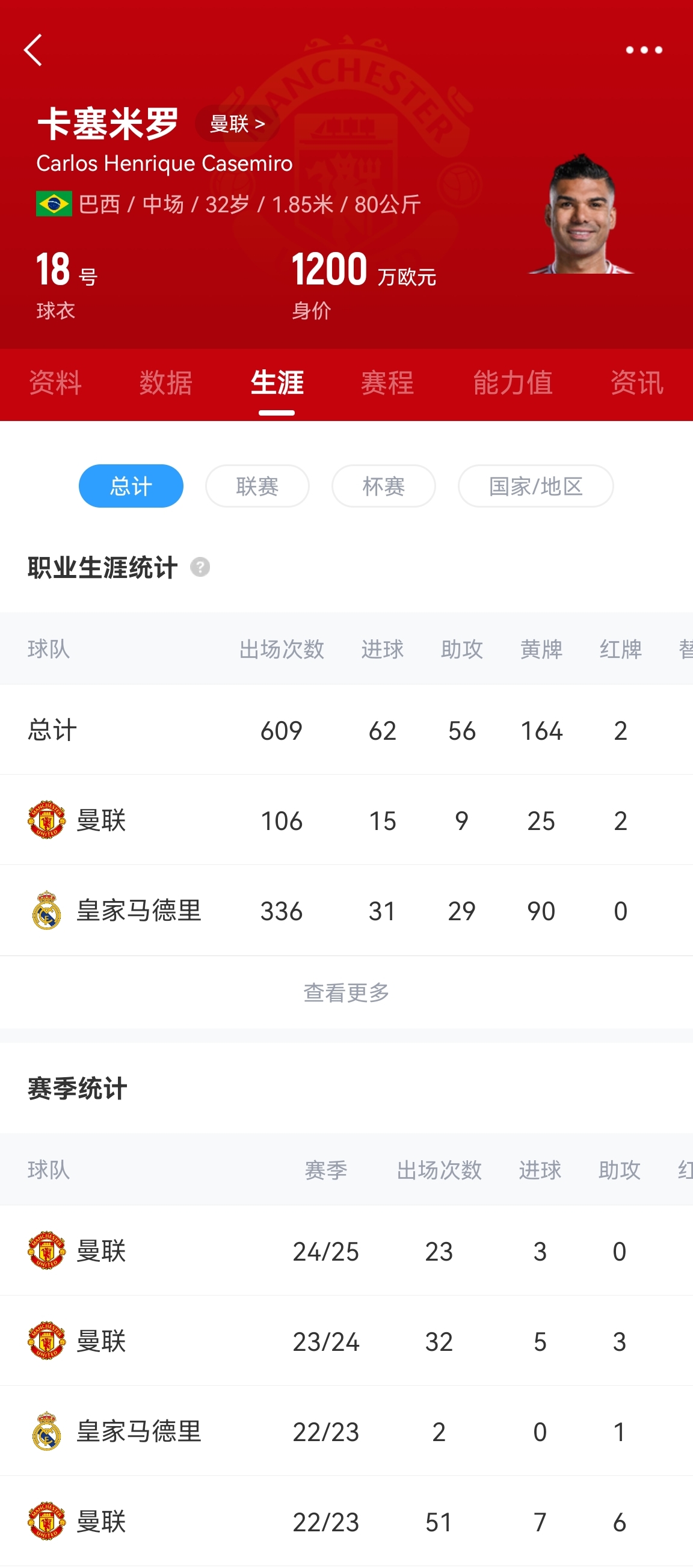 卡塞米羅2022年以7065萬(wàn)歐元轉(zhuǎn)會(huì)加盟曼聯(lián),他的年薪高達(dá)稅前1820萬(wàn)英鎊。