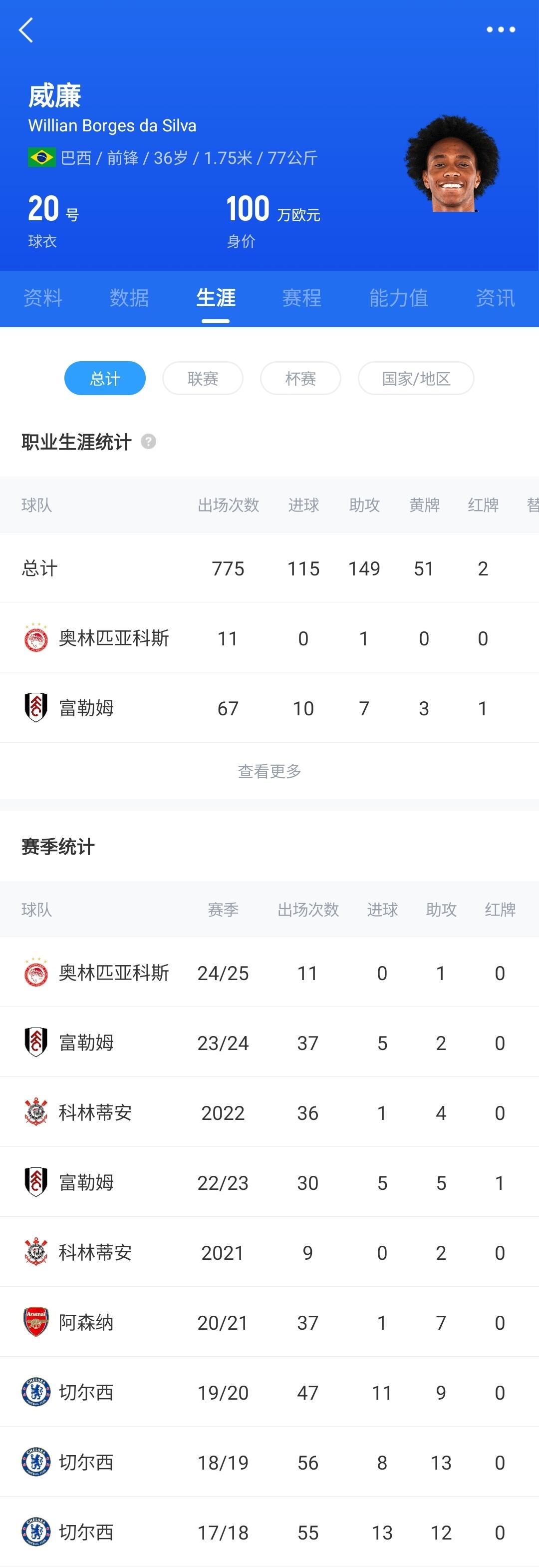 36歲的威廉生涯曾效力切爾西、阿森納等隊,他曾于2022-2024效力富勒姆,共為富勒姆出場67次打入10球7助攻。