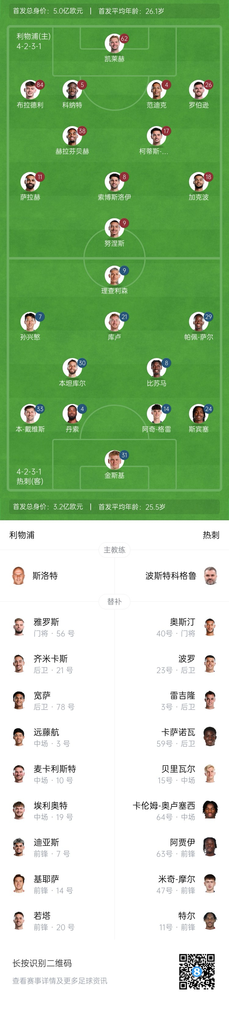 利物浦替補:56-雅羅斯、3-遠藤航、7-路易斯-迪亞斯、10-麥卡利斯特、14-基耶薩、19-埃利奧特、20-若塔、21-齊米卡斯、78-寬薩