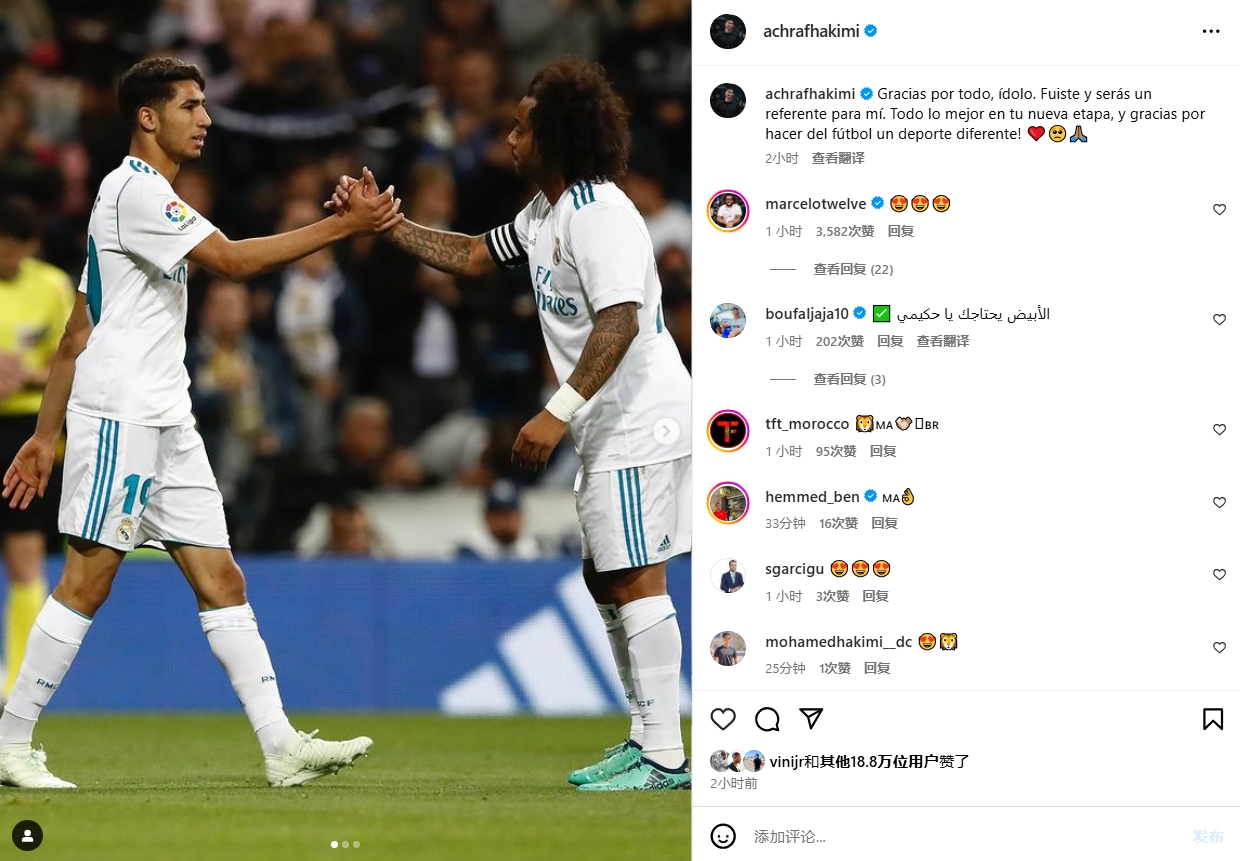 阿什拉夫曬出自己和馬塞洛的同框照,并表示:“謝謝你所做的一切,偶像。你曾經(jīng)是、將來也仍然是我的榜樣。祝你在新的舞臺一切順利,感謝你讓足球變得截然不同?!?/p>