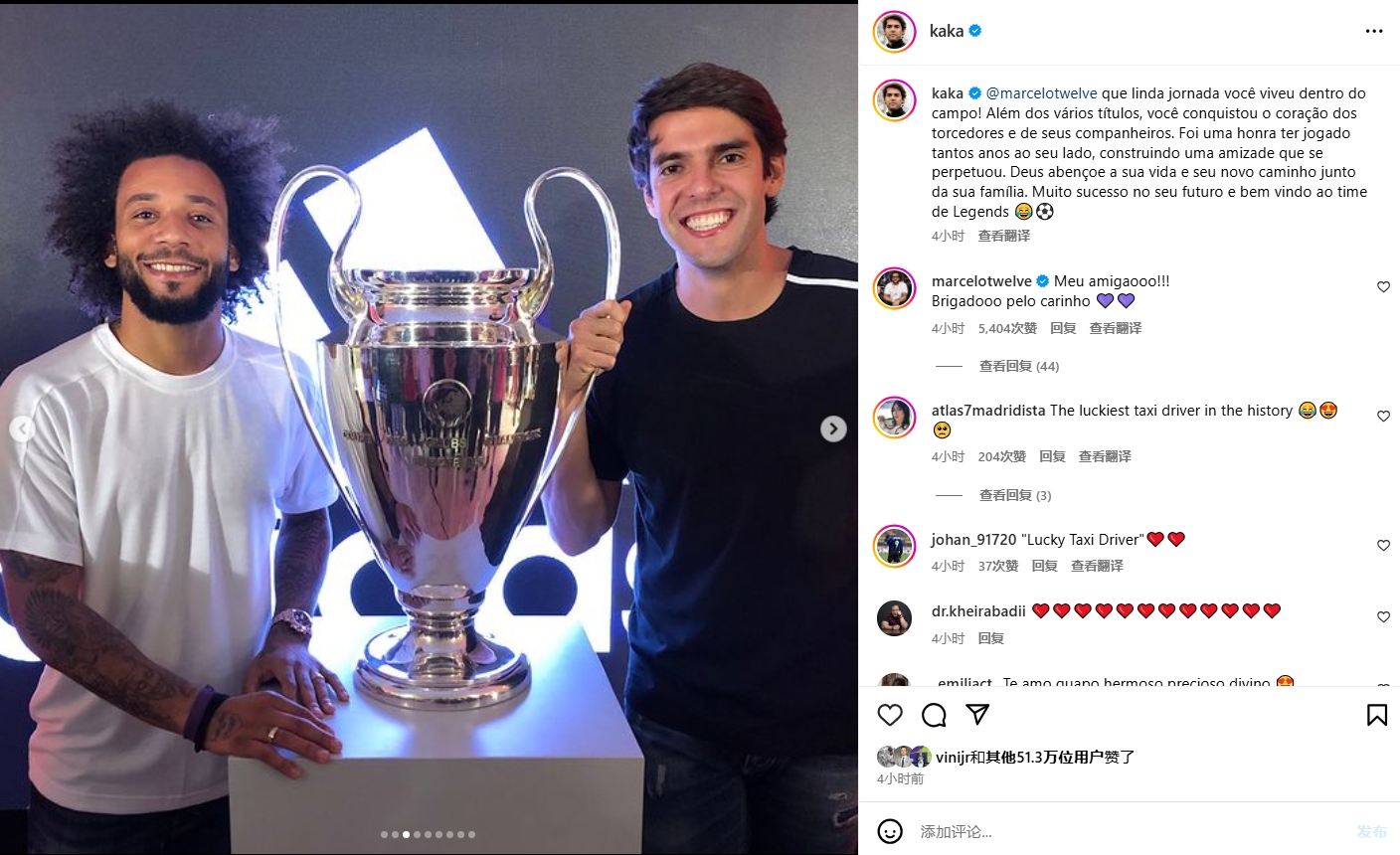 卡卡社媒曬出與馬塞洛的合照,并寫道:“馬塞洛,你在球場上的旅程多么美好!除了許多冠軍,你還贏得了球迷和隊(duì)友的心?!?/p>
