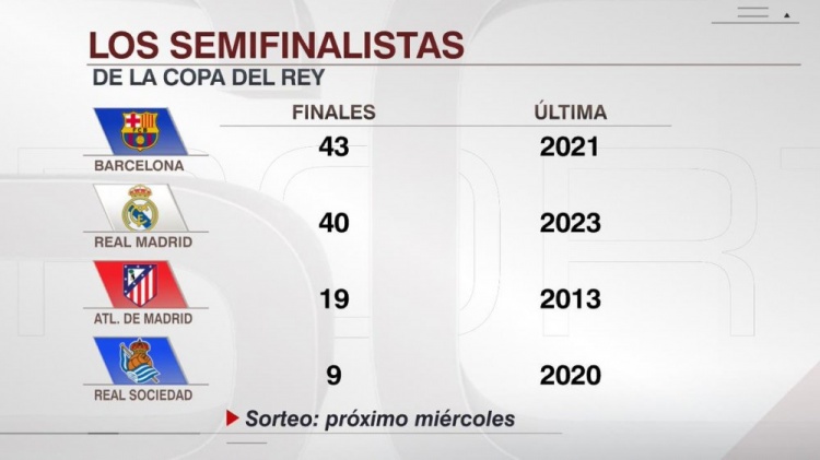 ESPN統(tǒng)計了四支半決賽球隊歷史上晉級國王杯決賽的次數(shù),巴薩以43次居首,皇馬40次第二。