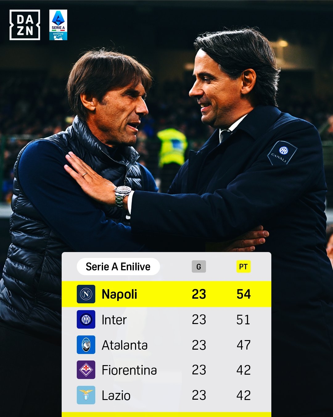本賽季的意甲打完23輪,爭(zhēng)冠形勢(shì)漸漸清晰:孔蒂帶隊(duì)的那不勒斯,與衛(wèi)冕冠軍小因扎吉的國(guó)米是最被看好的兩隊(duì)。此前一度排在榜首的亞特蘭大近期6輪僅1勝,后勁不足漸漸掉隊(duì)。