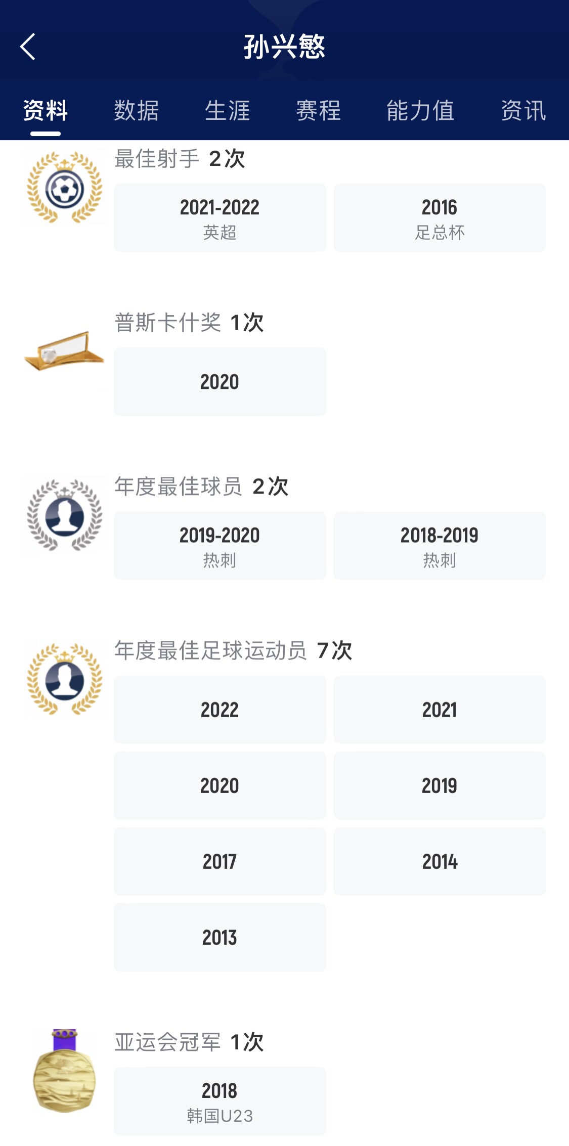 孫興慜2010年代表漢堡首次出戰(zhàn)職業(yè)聯(lián)賽,2013加盟勒沃庫(kù)森,2015年加盟熱刺,俱樂部層面尚未贏得任何冠軍榮譽(yù)。
