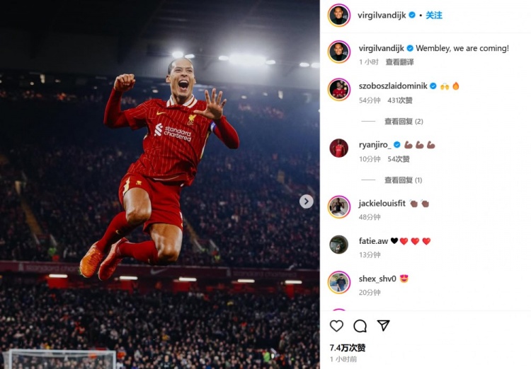 范迪克在賽后通過社媒曬出自己的慶祝照,并配文:“溫布利,我們來了!”